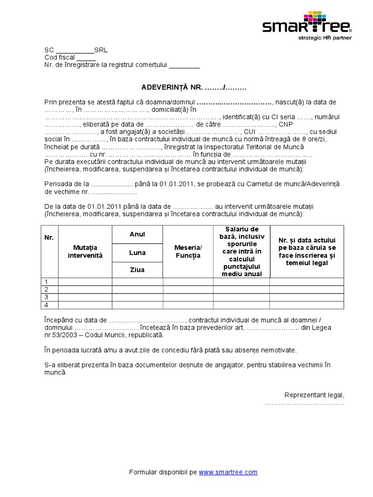 Adeverința de vechime în muncă este un act esențial în economia raporturilor de muncă. Ma intereseaza un model completat pentru a fi sigura ca procedez corect. Angajat anterior datei de 01.01.2011, cu o modificare de salariu si cu data incetarii ulterioara datei de 01.01.2011.