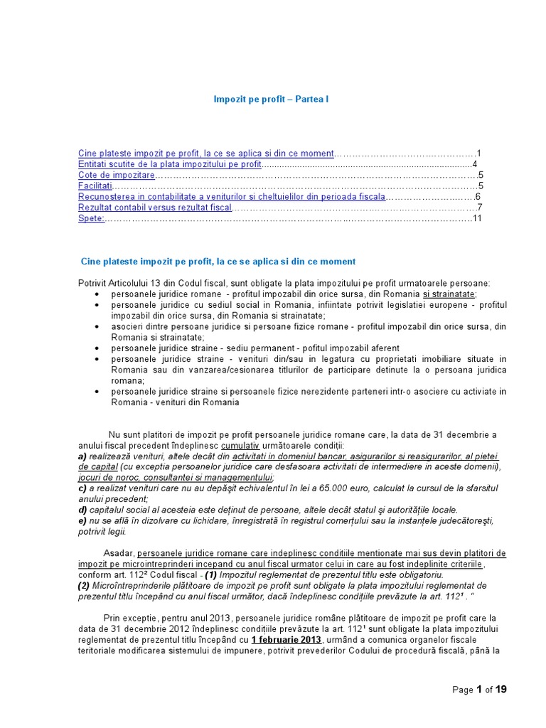 Pentru contribuabili, acest impozit reprezintă, deci, un cost pentru desfășurarea activităților vizate. De exemplu, daca dividendele se platesc in luna iunie, atunci impozitul se declara si se plateste pana in 25 iulie. A) în cazul persoanelor juridice române şi al persoanelor juridice cu sediul social în românia, înfiinţate potrivit legislaţiei europene, asupra profitului impozabil obţinut din orice sursă, atât din românia, cât şi din străinătate;